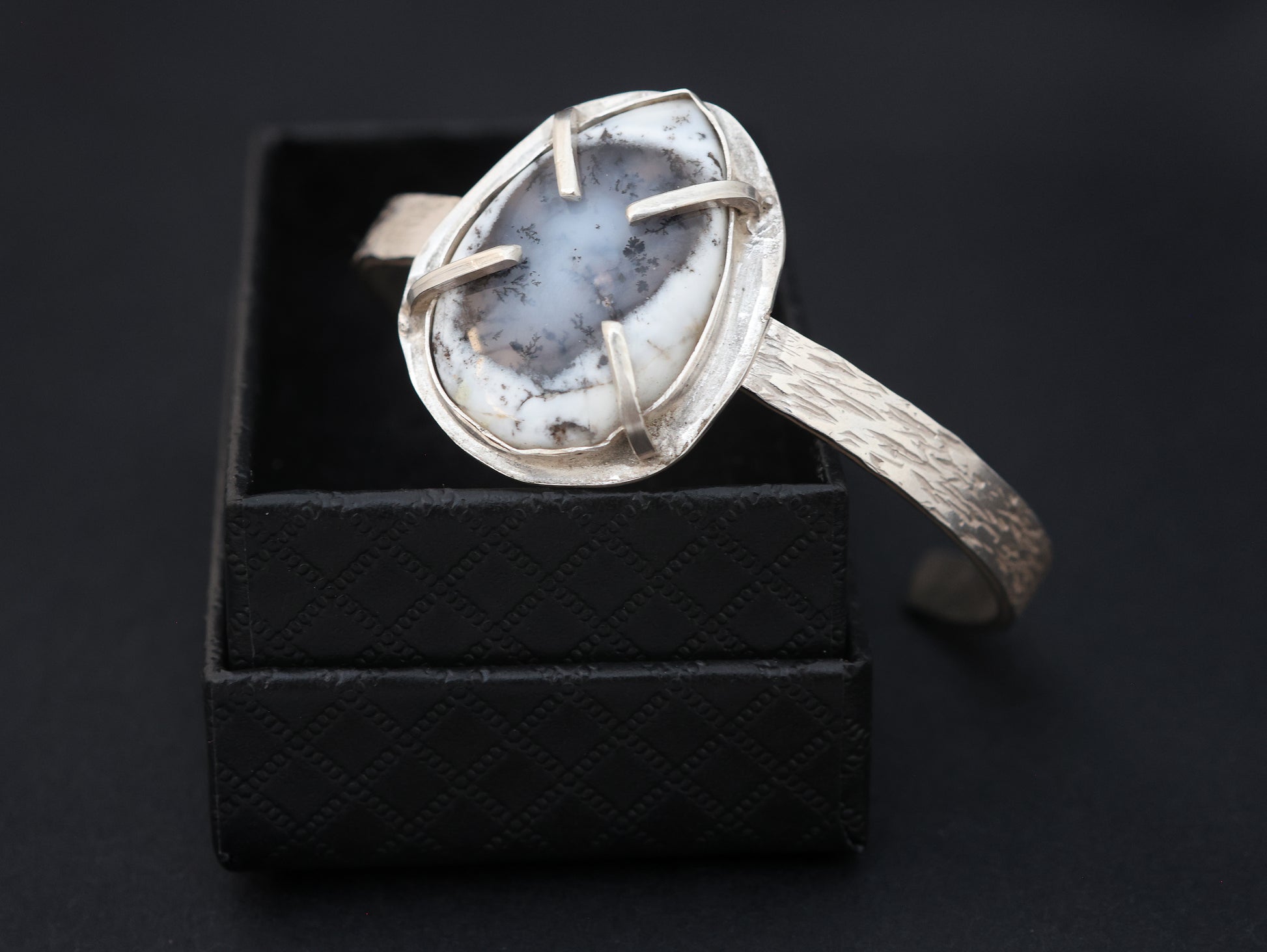 This piece is handmade in Sterling silver. The dendritic opal is set in two ways.